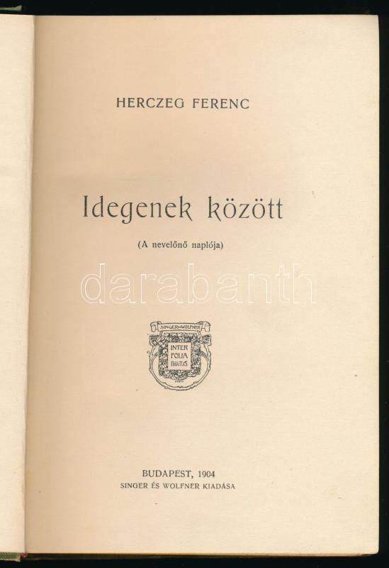 Herczeg Ferenc: Idegenek között. (A nevelőnő naplója.) Herczeg Ferenc Munkái. Bp., 1904, Singer és Wolfner, 189+(3) p. Kiadói egészvászon-kötés, nagyrészt jó állapotban.