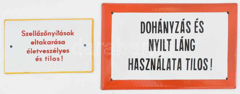2 darab zománcozott fém tábla, "Dohányzás és nyilt láng használata tilos!" és "Szellőzőnyílások eltakarása életveszélyes és tilos!" feliratokkal, 10x16 cm, 16x25 cm