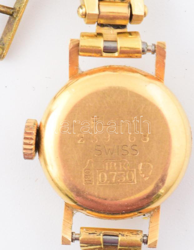 Beschreibung: 18K arany (Au) Filca női karóra kézi felhúzós szerkezettel, jelzett, működik, d: 15 mm fém szíjjal