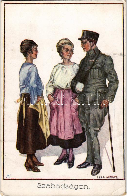 Beschreibung: Szabadságon. Osztrák-magyar sérült katona / WWI K.u.K. military art postcard with injured soldier. P.G.W.I. 151. s: Géza Lippay (EK)