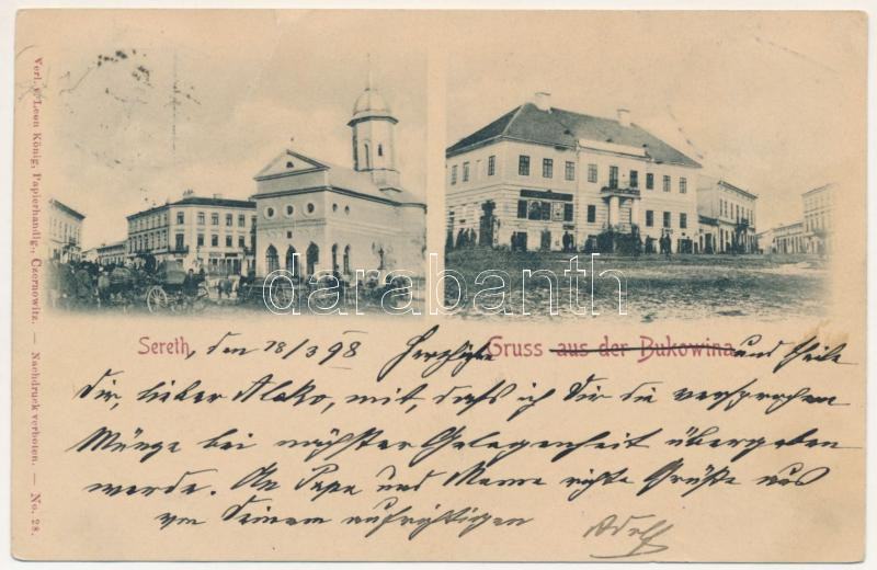 1898 (Vorläufer) Siret, Sereth, Szeretvásár (Bukovina, Bucovina, Bukowina); Orthodox church, town hall, market square, shops. Verlag v. Leon König (tear)