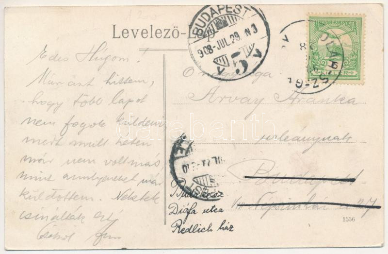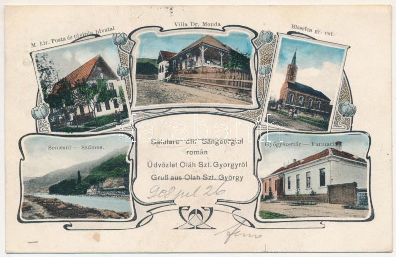 1908 Oláhszentgyörgy, Sangeorgiul Roman, Sangeorz-Bai; M. kir. posta és távirdahivatal, Villa Dr. Monda, Görögkatolikus templom, Szamos folyó, gyógyszertár. Szecessziós-virágos keret / post and telegraph office, villa, Greek Catholic church, Somes riverside, pharmacy. Art Nouveau, floral frame (felületi sérülés / surface damage)