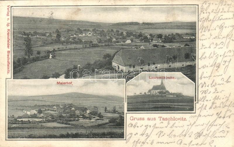 Beschreibung: Tasnovice, Taschlowitz (Horsovsky Tyn, Bischofteinitz); Maierhof, Laurentikirche / church (EK)