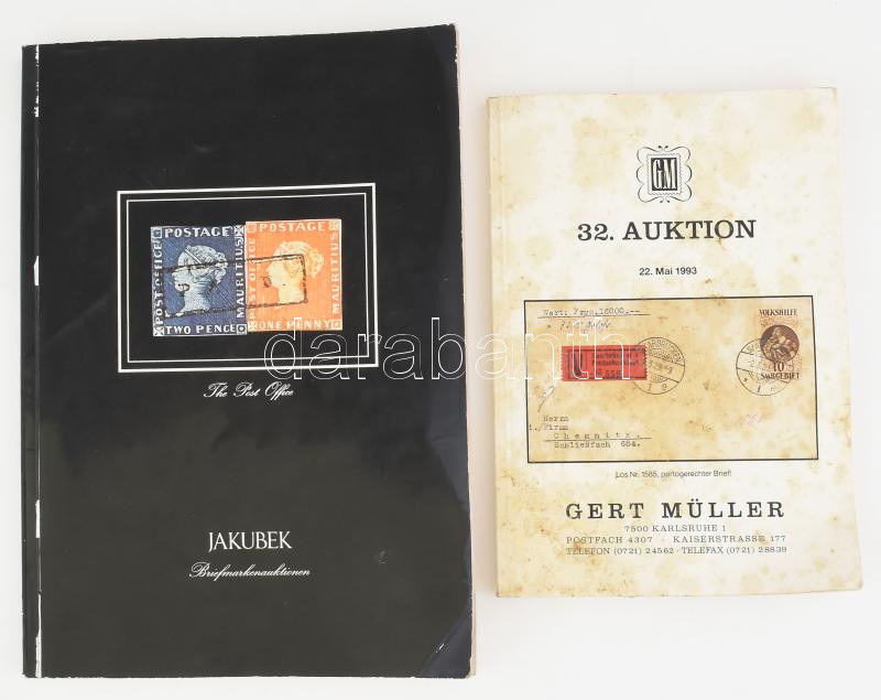 Beschreibung: Gert Müller és Jakubek 2 darab aukciós katalógus, bélyegek témában, 1985-1993.