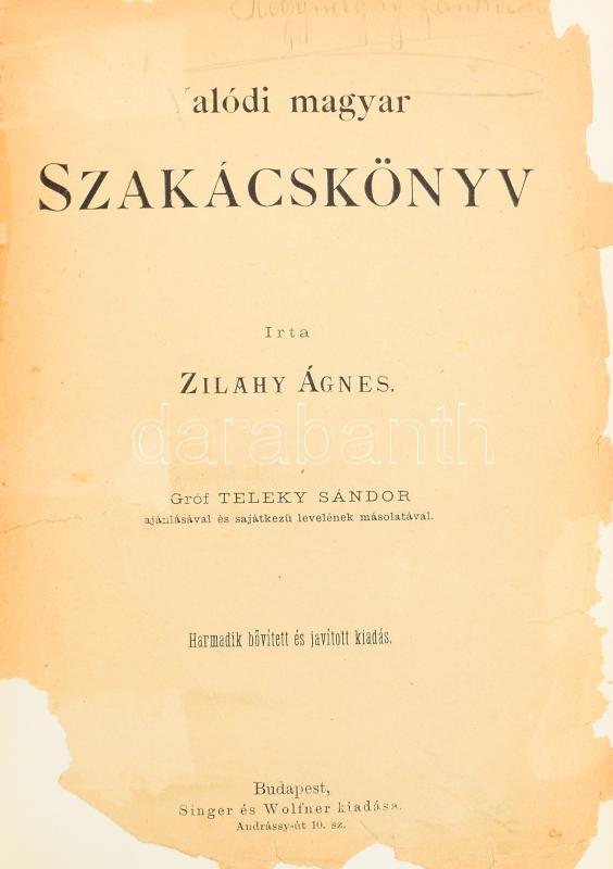 Zilahy Ágnes: Valódi magyar szakácskönyv. Gróf Teleki Sándor ajánlásával és sajátkezű levelének másolatával. Bp., [1894?], Singer és Wolfner, 371+1 p.+ 1 t. Átkötött egészvászon-kötés, egy lap restaurált, egy lap kijár (369/370 p.), egy lap sérült, néhány foltos lappal.