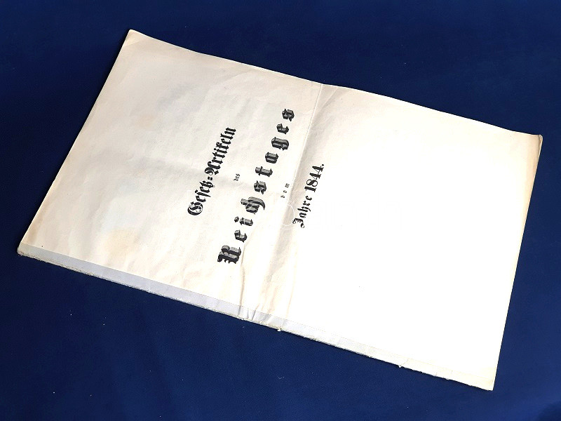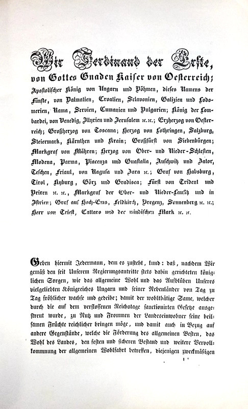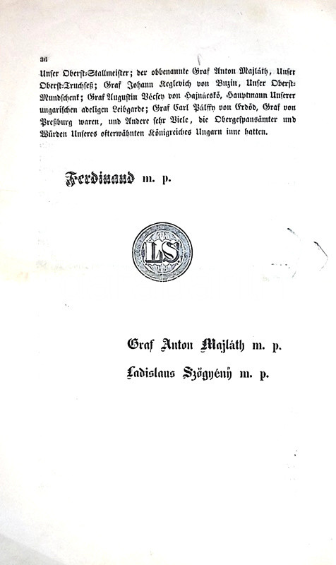Az 1843-1844. évi pozsonyi országgyűlésen hozott törvények és rendelkezések gyűjteménye, köztük a korszakos jelentőségű II. törvénnyel, mely a magyar nyelvet hivatalossá, államnyelvvé emelte. A reformkori ellenzék egyik évtizedes követelése teljesült e törvénykezéssel. Német nyelvű dokumentumunk végén V. Ferdinánd magyar király, Majláth Antal udvari főkancellár és Szőgyény László udvari tanácsos nyomtatott ellenjegyzései.