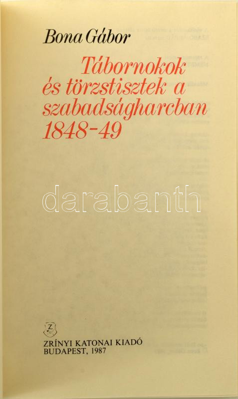 Bona Gábor: Tábornokok és törzstisztek a szabadságharcban 1848-49. Bp., 1987, Zrínyi, 426+(6) p. Második, bővített és javított kiadás. Kiadói egészvászon-kötés, kiadói papír védőborítóban. Az elülső szennylapon gróf Tisza Zsolt Domokos (1983- ) névbejegyzésével.