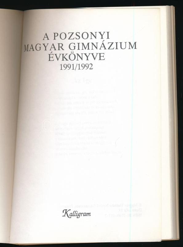 A pozsonyi magyar gimnázium évkönyve 1991/1992. Pozsony, 1992, Kalligram. Kiadói papírkötés.