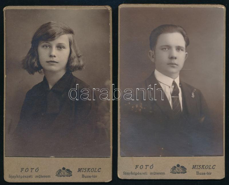 Beschreibung: cca 1915-1920 Fiatal lány és fiú portréi, 2 db vizitkártya, "Fotó" fényképészeti műterem, Miskolc, 10,5x6,5 cm