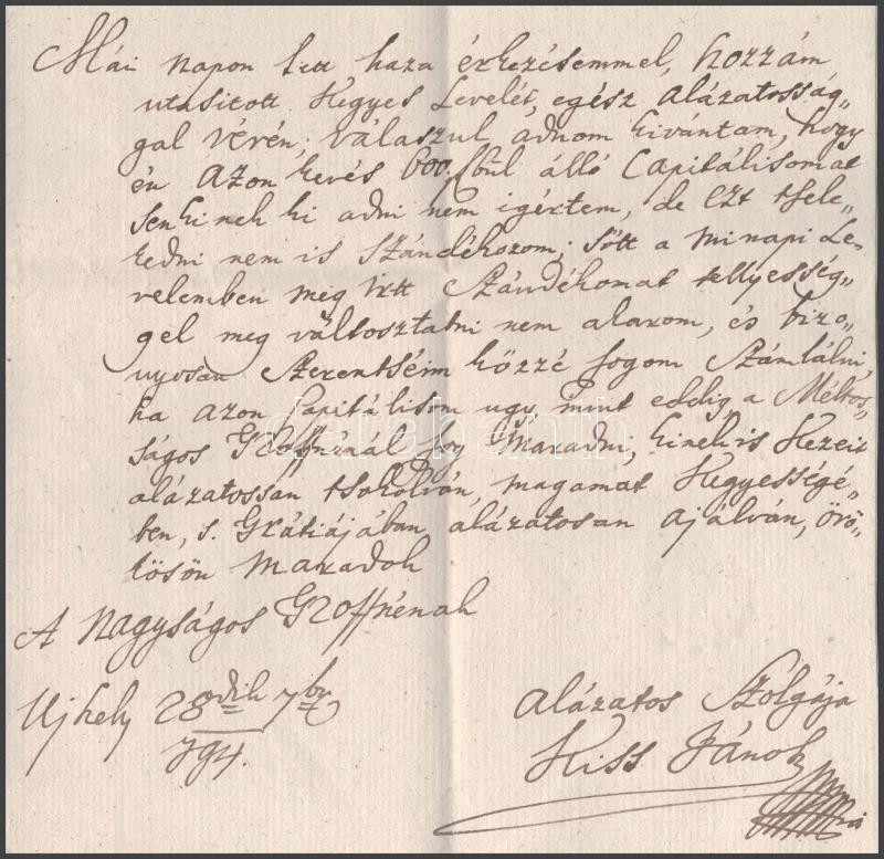 1794 [Sátoralja]újhely, Kiss János levele Zéténybe, "Méltóságos Keresztszegi Gróff Csáky Anna Asszonynak, néhai Méltóságos Zétényi Gróff Klobusiczky Antal Ur Eö Nagysága el maradott Eözvegyének, Eö Nagyságának"..., eredeti borítékkal, 1 beírt oldal, 2 sztl. lev.