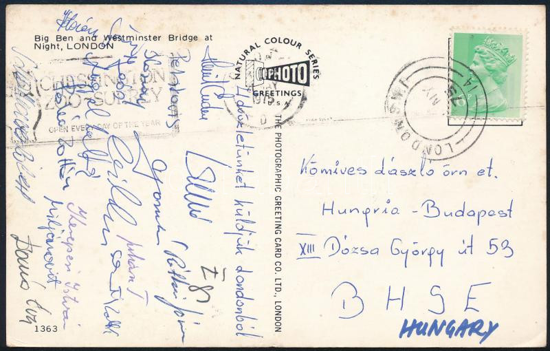 Beschreibung: 1975 A BHSE (Honvéd) különféle sportolóinak aláírásai Londonból / Hungarian team autograph postcard