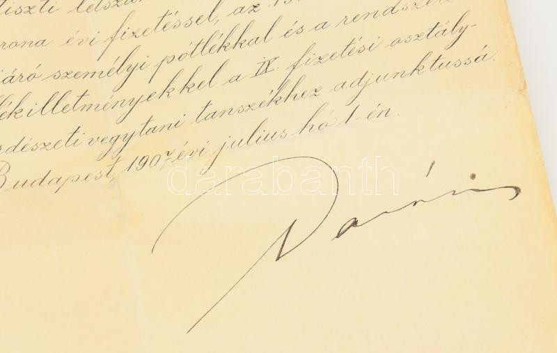 Beschreibung: Darányi Ignác (1849-1927) földművelésügyi miniszter Zemplén Géza főiskolai adjunktus kinevezési okiratán