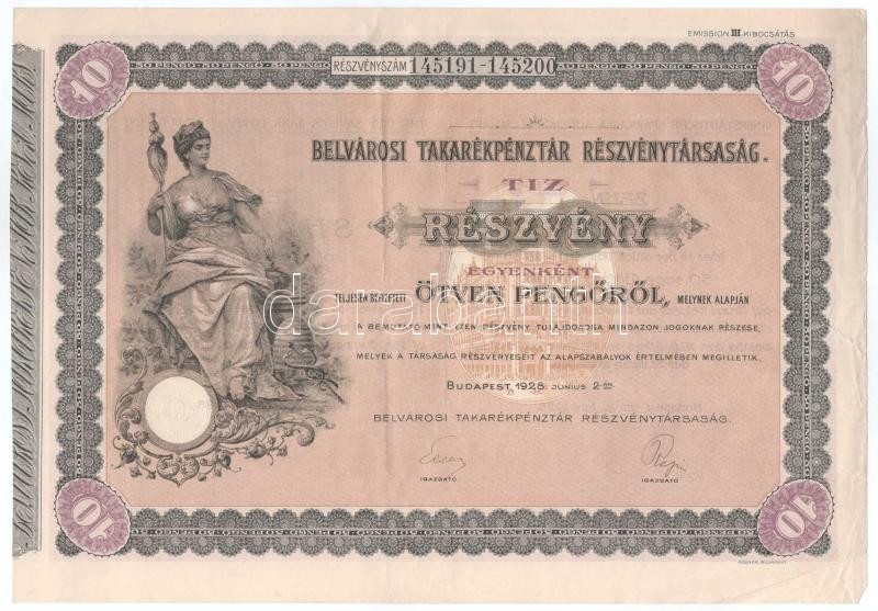 Budapest 1926-1928. "Belvárosi Takarékpénztár Részvénytársaság&qu... https://www.darabanth.com/de/491-Fernauktion/491.0/Numismatik/Aktien-und-Tickets~2000006/Budapest-1926-1928-Belvarosi-Takarekpenztar-Reszvenytarsasag-ot-reszvenye-egyben-egye~II3373278