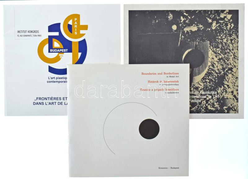 Vegyes 3db-os emlékérem, kisplasztika katalógus: 1990. "XIV. Nemzetközi Éremművészeti és Kisplasztikai Alkotótelep" + 2002. "Határok és határesetek az éremművészetben" + 2003. "Határok és átjárások az éremművészetben" mind a három újszerű állapotban, de az egyik oldalra tollal írtak