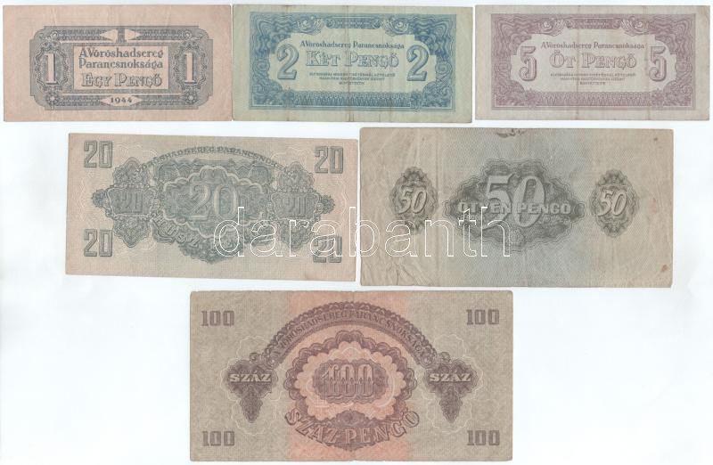 Beschreibung: 1944. 1P - 100P "A Vöröshadsereg Parancsnoksága" (6xklf) T:F-VG, közte szép papír
