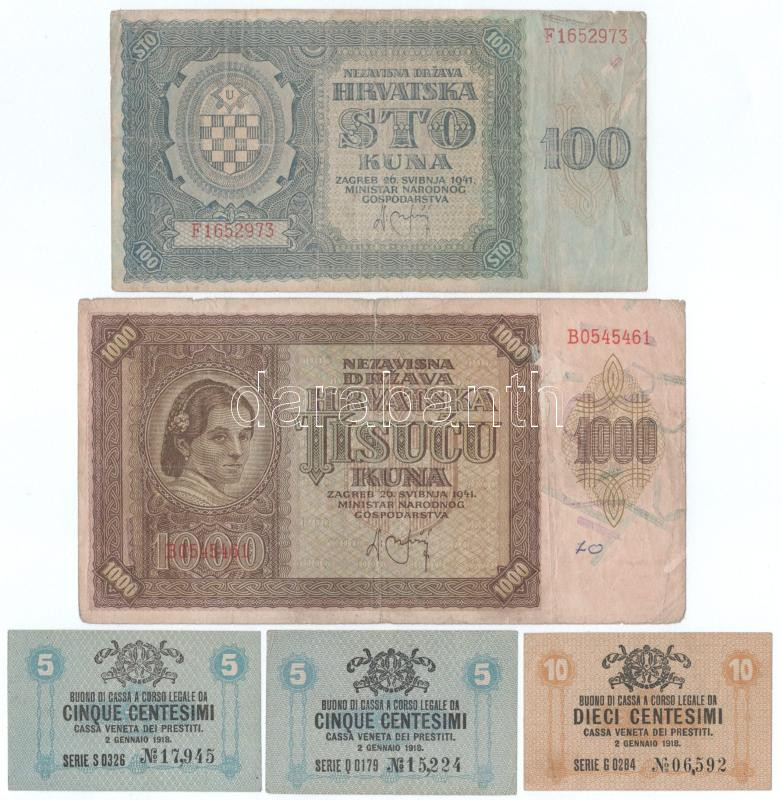 Beschreibung: Olaszország / Velence / Osztrák-magyar megszállás 1918. 5c (2x) + 10c + Horvátország / Független Horvát Állam 1941. 100K + 1000K T:VF-VG, szakadás