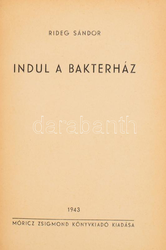 Rideg Sándor: Indul a bakterház. Bp.,, 1943, Móricz Zsigmond Könyvkiadó,(Pesti Lloyd-ny.), 160 p. Ritka, első kiadás! Korabeli átkötött félvászon-kötés, kopott borítóval.