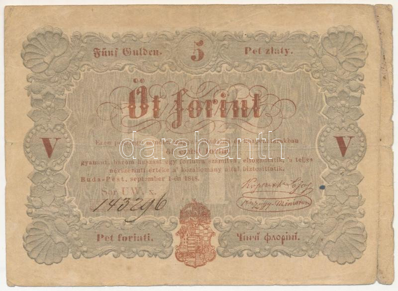1848. 5Ft barna nyomat "UW.x. 143296" "Kossuth bankó" hátoldalon palas... https://www.darabanth.com/de/493-Fernauktion/493.0/Numismatik/Ungarische-Banknoten~2000008/1848-5Ft-barna-nyomat-UWx-143296-Kossuth-banko-hatoldalon-palaszurke-szinvaltozat~II3380333