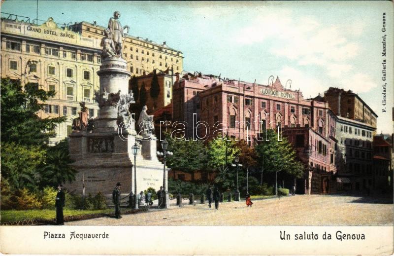 Genova, Genoa; Piazza Acquaverde / square, monument, London Hotel, Gra... https://www.darabanth.com/de/496-Fernauktion/496.0/Ansichtskarten/Italien~2500049/Genova-Genoa-Piazza-Acquaverde-square-monument-London-Hotel-Grand-Hotel-Savoie-EK~II2635509