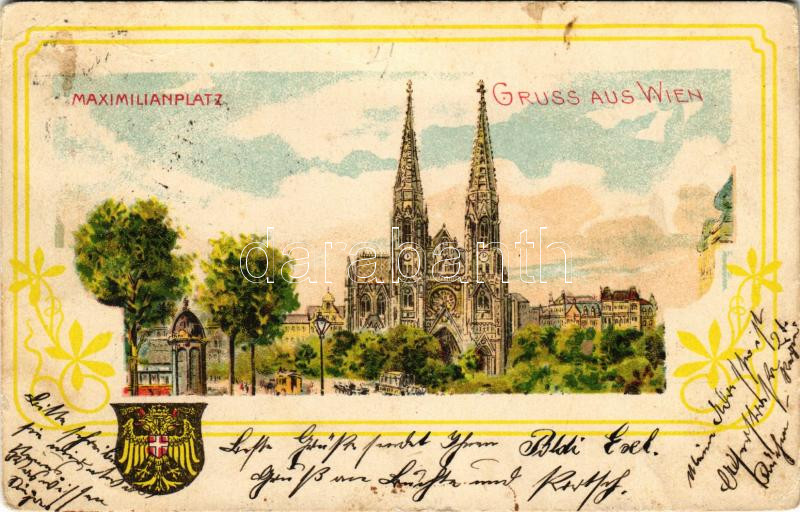 Wien, Vienna, Bécs; Maximilianplatz / square, church, coat of arms. Ar... https://www.darabanth.com/de/496-Fernauktion/496.0/Ansichtskarten/Osterreich~2500021/Wien-Vienna-Becs-Maximilianplatz-square-church-coat-of-arms-Art-Nouveau-floral-litho-EB~II2961726