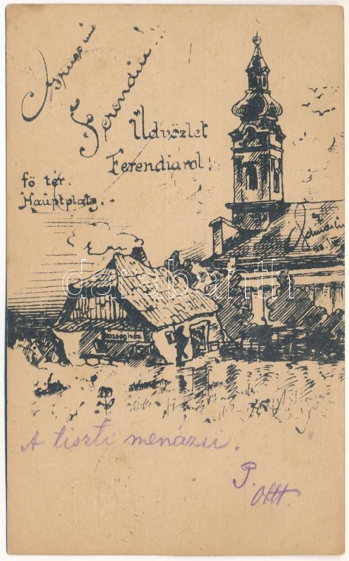 Beschreibung: 1898 (Vorläufer) Ferendia, Ferend; Fő tér, községháza, templom. Rajzos művészlap / main square, town hall, church. Art postcard (vágott / cut)