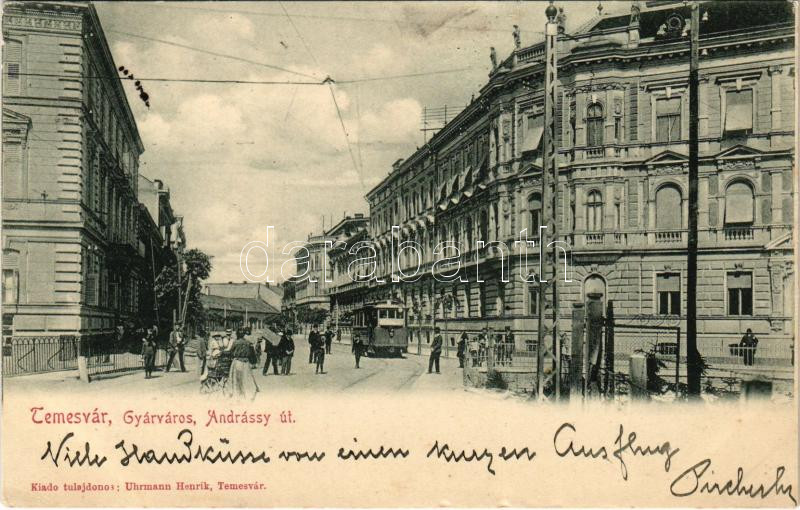 1902 Temesvár, Timisoara; Gyárváros, Andrássy út, villamos. Uhrmann He... https://www.darabanth.com/de/496-Fernauktion/496.0/Ansichtskarten/Siebenburgen~2500006/1902-Temesvar-Timisoara-Gyarvaros-Andrassy-ut-villamos-Uhrmann-Henrik-kiadasa-Fabric-s~II2795891