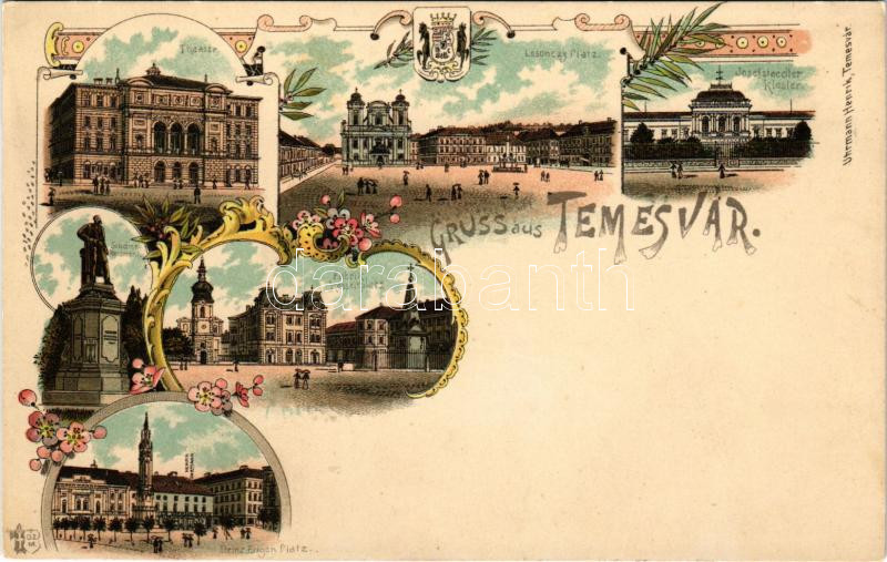 Temesvár, Timisoara; Theater, Losonczy Platz, Josefstädter Kloster, Fabrik, Kossuthplatz, Scudier-Monument, Prinz Eugen Platz / Színház, Józsefvárosi zárda, Gyárváros, Kossuth tér, Jenő herceg tér, Losonczy tér, Scudier szobor. Uhrmann Henrik kiadása / theatre, squares, nunnery, monument. O.Z.M. Art Nouveau, floral, litho