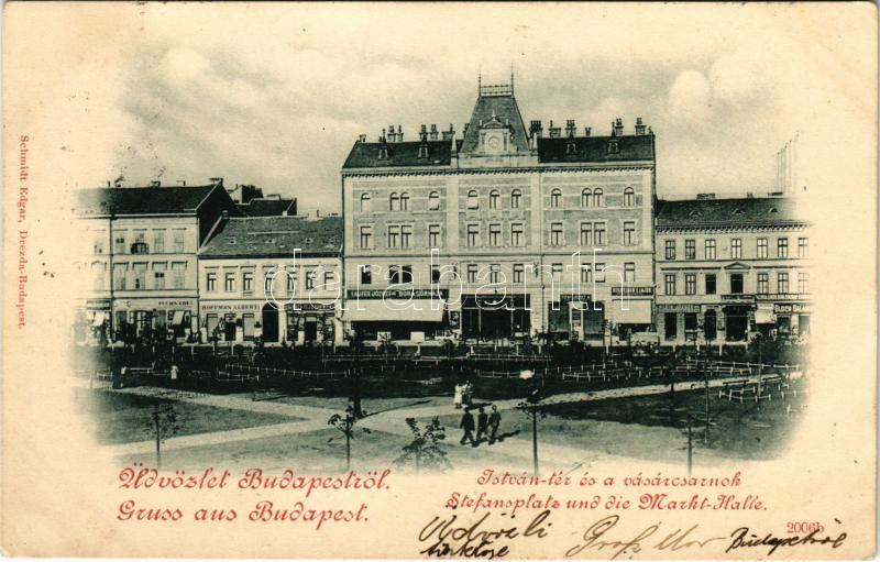 1899 (Vorläufer) Budapest VII. István tér (Klauzál tér) és a vásárcsarnok, Laufer József bor és sörháza, Werzfelder Lajos, Bloch, Klein József, Tichy József, Hoffmann Albert, Fuchs Ede üzlete, kávé és tejcsarnok (Rb)