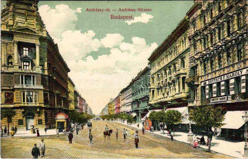 Beschreibung: 1908 Budapest VI. Andrássy út, Deutsch F. Károly üzlete, Dr. Nobel fogorvos, Terézvárosi takarékpénztár, Fonciere biztosító