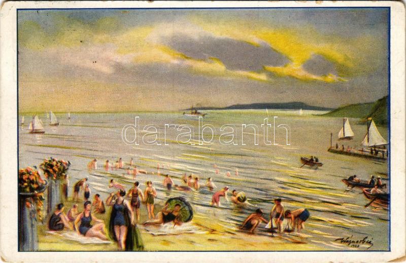 Beschreibung: Balaton, Turisztikai reklámlap, fürdőzők. Magyar Királyi Államvasutak Igazgatósága s: Wágner Géza (EK)