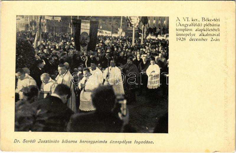 Budapest XIII. Dr. Serédi Jusztinián bíboros hercegprímás ünnepélyes fogadása a Béke téri (Angyalföldi) plébániatemplom alapkőletételi ünnepélye alkalmával 1928. december 2-án. Id. Weinwurm Antal kiadása (EK)