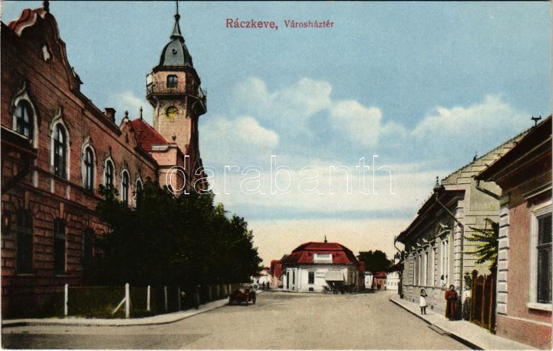 Beschreibung: Ráckeve, Városház tér, városháza, Szentháromság gyógyszertár (tulajdonos Németh Sándor), autó. Münich Jenő könyvnyomdája kiadása