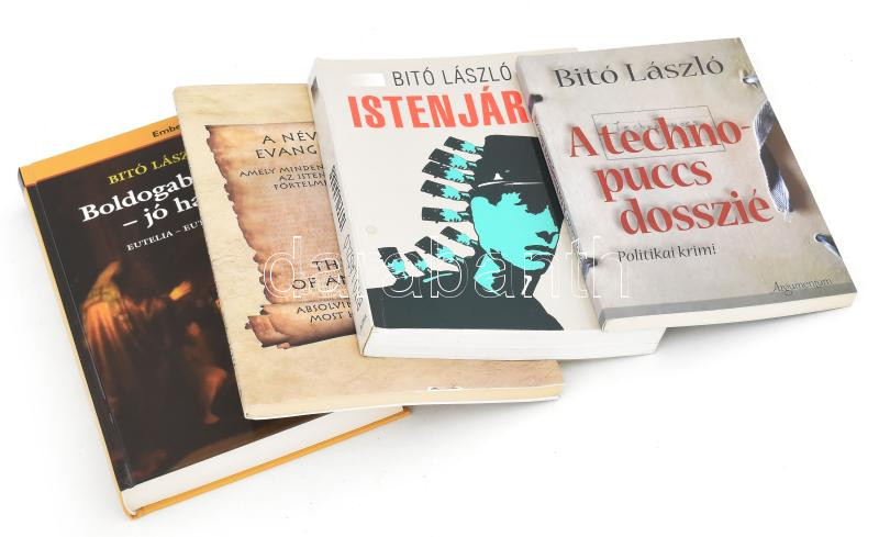 Bitó László 4 műve. Mind a szerző, Bitó László (1934-2021) író, kutatóorvos által Mohás Lívia (1928-2024) pszichológus, József Attila-díjas írónak DEDIKÁLT példányok. Istenjárás. Trianon trilógia I: hn., 1994, Aura. Kiadói papírkötés.; A névtelen evangéliuma. Amely minden népet feloldoz az istengyilkosság förtelmes bűne alól. hn., 2011, Argumentum. Magyar és angol nyelven. Kiadói papírkötés.; Boldogabb élet - jó halál. Eutelia - eutanázia. Emberi tényező. hn., 2005, Argumentum. Kiadói kartonált papírkötés.; A technopuccs-dosszié. Politikai krími. hn., 2007., Argumentum. Kiadói papírkötés.;