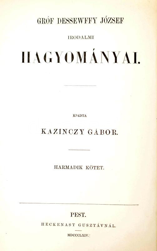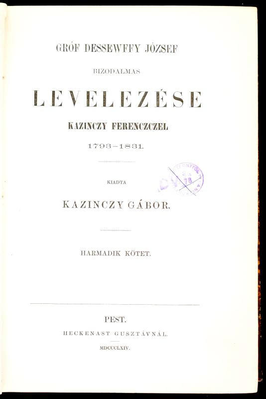 Gróf Dessewffy József bizodalmas levelezése Kazinczy Ferenczczel 1793-1831. III. köt. Kiadta: Kazinczy Gábor. Gróf Dessewffy József irodalmi hagyományai I. Pest, 1864, Heckenast Gusztáv, 2 sztl. lev.+ 389p. + hozzákötve: Kazinczy Ferenc levelezése Berzsenyi Dániellel 1808-1831. Pest, 1860 Heckenast 274p. félvászon-kötésben,