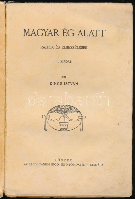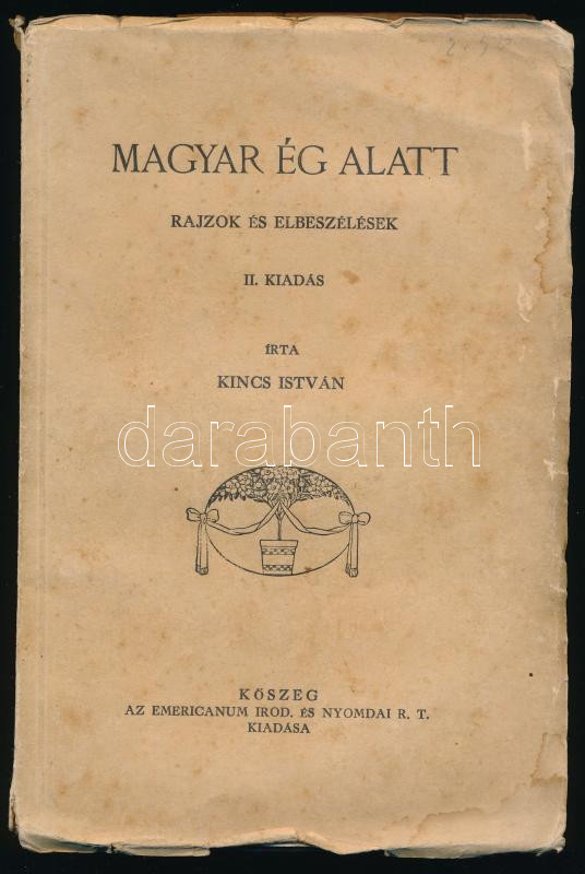 Kincs István: Magyar ég alatt. Rajzok és elbeszélések. Kőszeg, é.n., Emericanum Irod. és Nyomdai R.T., 208+(4) p. Második kiadás. Kiadói papírkötés, kissé viseltes, sérült, foltos borítóval, helyenként kissé sérült, foltos lapokkal.