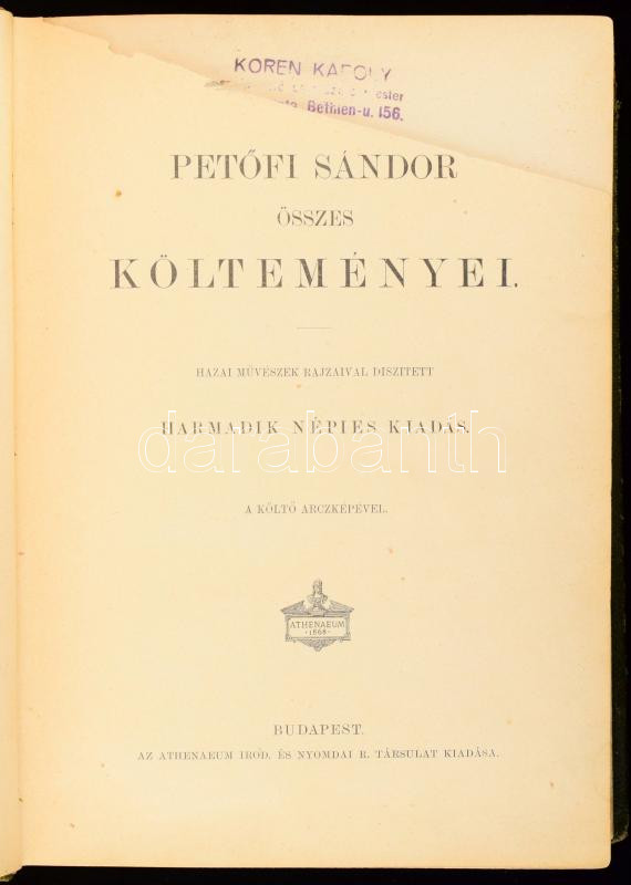 Petőfi Sándor összes költeményei. Hazai művészek rajzaival diszitett harmadik népies kiadás. Bp., é.n. (cca 1880), Athenaeum, 474 p. Szövegközti és egészoldalas illusztrációkkal, köztük Vaszary János, Benczúr Gyula, Bihari Sándor, Vágó Pál és mások műveivel. Kiadói aranyozott egészbőr-kötés, viseltes, sérült borítóval és gerinccel, a címlapon hiánnyal, helyenként kissé sérült, foltos lapokkal, tulajdonosi bélyegzőkkel.