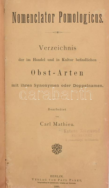 Mathieu, Carl: Nomenclator Pomologicus. Verzeichnis der im Handel und in Kultur befindlichen Obst-Arten mit ihren Synonymen oder Doppelnamen. Bearbeitet von - - . Berlin, 1889, Paul Parey, IV+(4)+538+(16) p. Első kiadás. Német nyelven. Kiadói aranyozott egészvászon-kötés, kissé viseltes, foltos borítóval, vetemedett kötéstáblákkal, a belső kötéstáblákon és a szennylapokon ázásnyomokkal, a címlapon lapszéli sérülésekkel, korabeli tulajdonosi bélyegzővel: ,,Katona Zsigmond Kecskemét Katonatelepi szőlészete" (gelei Katona Zsigmond (1828-1902) gyógyszerész, szőlész, gyümölcskertész; róla kapta nevét a kecskeméti Katonatelep). Rendkívül ritka! Magyarországi aukción még nem szerepelt!