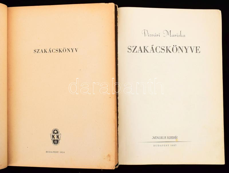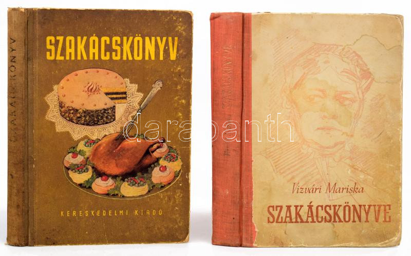 Venesz József (szerk.): Szakácskönyv. Bp., 1954, Kereskedelmi Könyvkiadó, 310 p. Kiadói félvászon kötés, kopott borítóval. + Vízvári Mariska szakácskönyve. Bp., 1957, Minerva, 399+1 p. Kiadói félvászon kötés, kopott borítóval, laza fűzéssel, az elülső szennylapon firkával, a hátsó szennylap hiányzik.