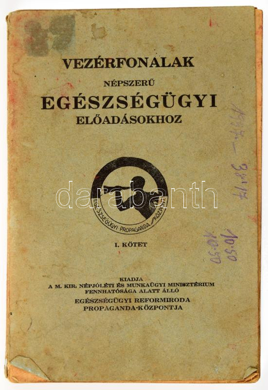 Vezérfonalak népszerű egészségügyi előadásokhoz. I. kötet. [Bp.], én.,M. Kir. Népjóléti és Munkaügyi Minisztérium Egészségügyi Propaganda Központja, 259 p. Kiadói papírkötés, foltos borítóval és lapokkal, a tartalomjegyzékben ceruzás aláhúzásokkal.