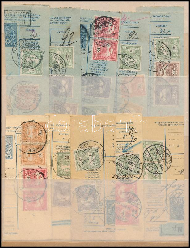 Beschreibung: 10 db csomagszállító szelvény Turul bélyegekkel, olvasható bélyegzésekkel