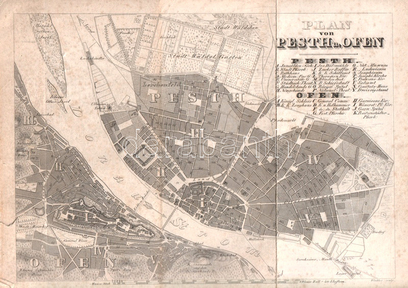 [Térkép] Plan von Pesth u. Ofen. Henry Winkles (1801-1860) angol grafikusművész német nyelven feliratozott térképmetszete Pest-Budáról (1844).