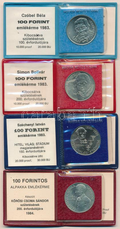 Beschreibung: 1983. 100Ft Cu-Ni-Zn "Czóbel Béla " + 100Ft Cu-Ni-Zn "Simon Bolivar " + 100Ft Cu-Ni-Zn "Széchenyi István " + 1984. 100Ft Cu-Ni-Zn "Kőrösi Csoma Sándor ", mindegyik eredeti műbőr tokban, tanúsítvánnyal T:BU