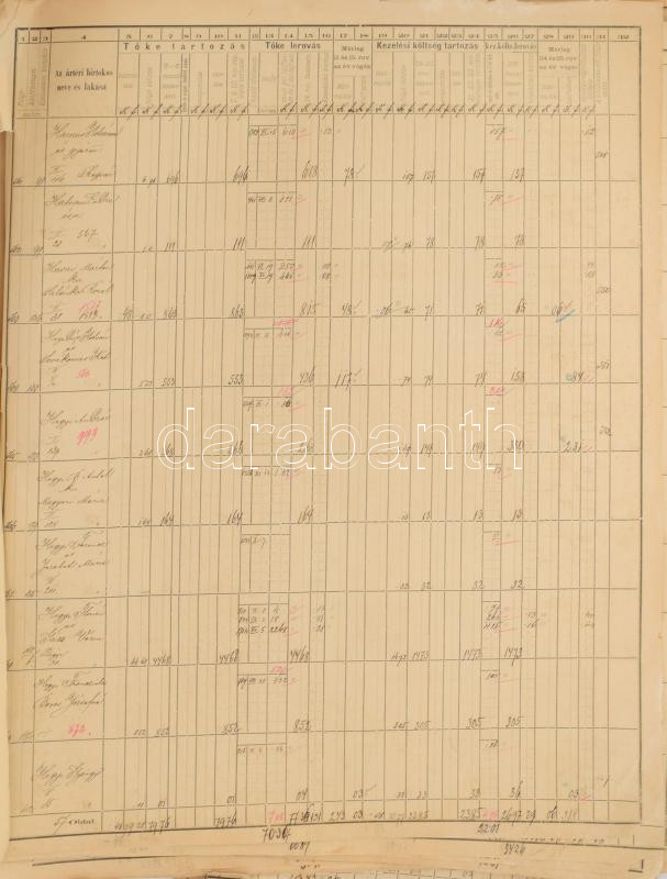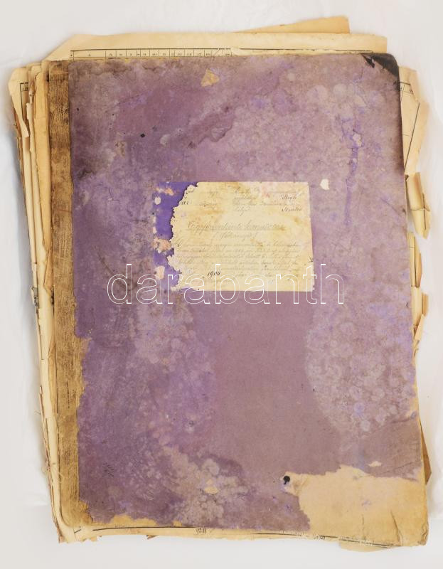 1900 A Körös-Tisza-marosi Ármentesítő és Belvízszabályozó Társulat főkönyve, egyénenkénti kimutatás ,,a magyar földhitelintézettől felvett 6 millió forint kölcsön után az érdekelt ártérbirtokosok által fizetendő tőke és kamattörlesztési járulékról [...]", összesen 1672 névvel. Nagyméretű, erősen sérült, széteső állapotban, kissé dohos, hiányzó hátsó borítóval, 63x46,5 cm