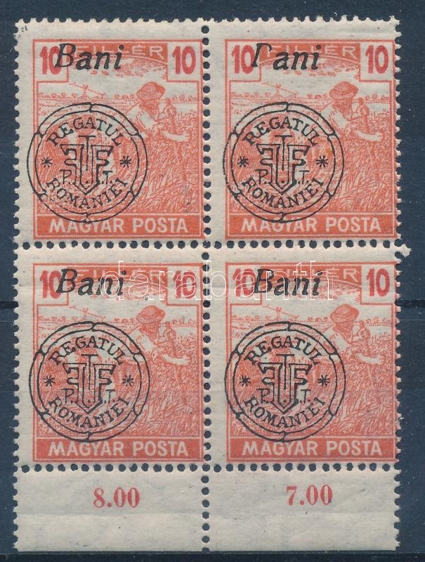 Beschreibung: Nagyvárad 1919 Arató 10f ívszéli 4-es tömbben, a jobb felső bélyeg felülnyomásán a "B" betű hiányos, Bodor vizsgálójellel