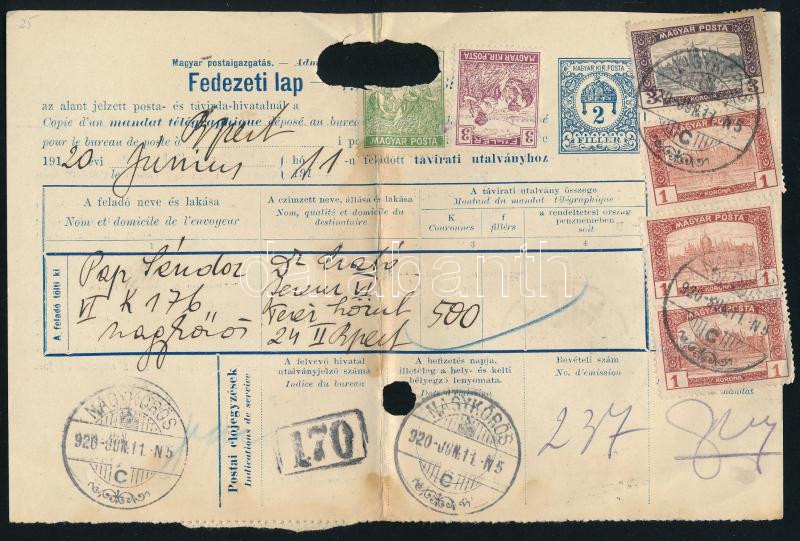 Beschreibung: 1920 Fedezeti lap 7 db bélyeggel (egyik sérült / 1 damaged) "NAGYKÖRÖS" - "BUDAPEST"