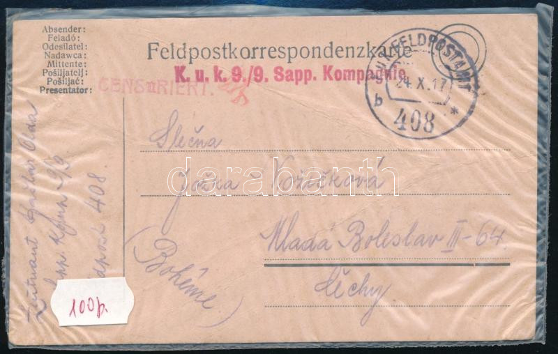 1917 Tábori posta levelezőlap "K.u.k. 9/9 Sapp. Kompagnie" +... https://www.darabanth.com/de/496-Fernauktion/496.0/Philatelie-und-Postgeschichte-Ungarn/Osterreich-Ungarische-Feldpost-Erster-Weltkrieg~1000041/1917-Tabori-posta-levelezolap-Kuk-99-Sapp-Kompagnie-plus-FP-408-b~II3057296