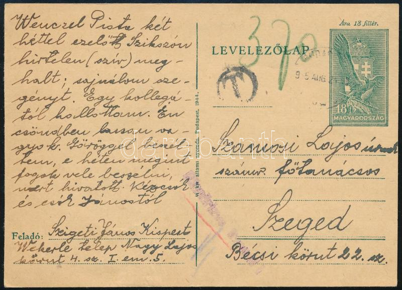 Beschreibung: 1945.aug.20. 18f díjjegyes levelezőlap 2P helyett 3,70P portóval "Ellenőrizve Szeged" bélyegzéssel, a cenzor kézjegyével