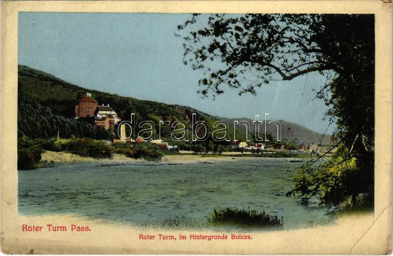 Vöröstoronyi-szoros, Roter-Turm-Pass, Pasul Turnu Rosu; Roter Turm, im Hintergrunde Boicza / Vörös torony, háttérben Bojca. Georg Meyer kiadása / red tower, Boita in the background (EB)