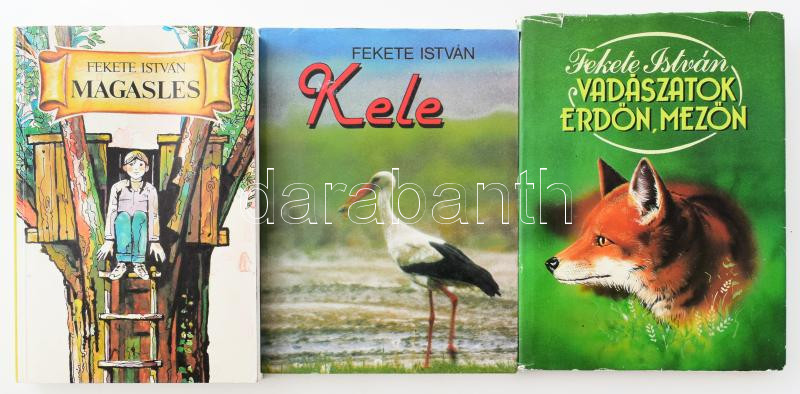 Fekete István 3 könyve: Vadászatok erdőn, mezőn. Vál. és szerk.: Véber Károly. Bp., 1987, Mezőgazdasági Kiadó. Kiadói egészvászon-kötés, kissé sérült kiadói papír védőborítóban. + Kele. Regény. (Bp., 1994), Nesztor. Kiadói papírkötés. + Magasles. A Fekete István hagyatékában maradt regénytöredéket folytatta és a kéziratot sajtó alá rend.: Nagy Domokos Imre. Bp., 1993, Officina Nova. Kiadói papírkötés, helyenként kisebb ázásnyomokkal.