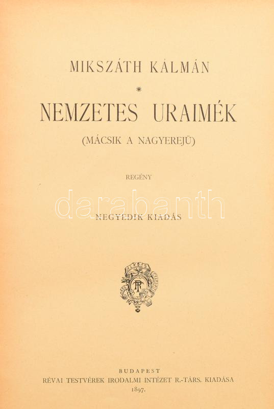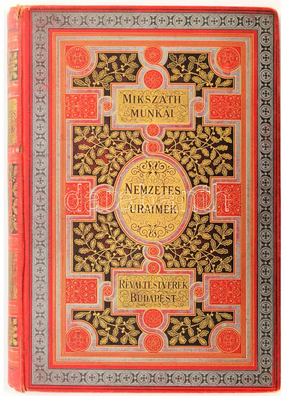 Mikszáth Kálmán: Nemzetes uraimék. (Mácsik a nagyerejű.) Bp.,1897, Révai,(Pallas-ny.), 8+226 p. 4 kiadás. Kiadói aranyozott, festett egészvászon-kötés, Gottermayer-kötés, festett lapélekkel, kopott borítóval, a gerincen kis sérüléssel.
